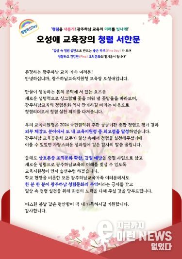 이번 청렴 서한문을 시작으로 진행되는 2025 광주하남교육지원청의 청렴 프로젝트의 핵심은 ‘청렴 Fine Day’로서, 광주하남 교육가족 모두의 일상 속 청렴 실천으로 만드는 좋은 하루(Fine Day)가 모여 청렴하고 건강(Fine)한 조직문화의 밑거름이 된다는 의미이다.