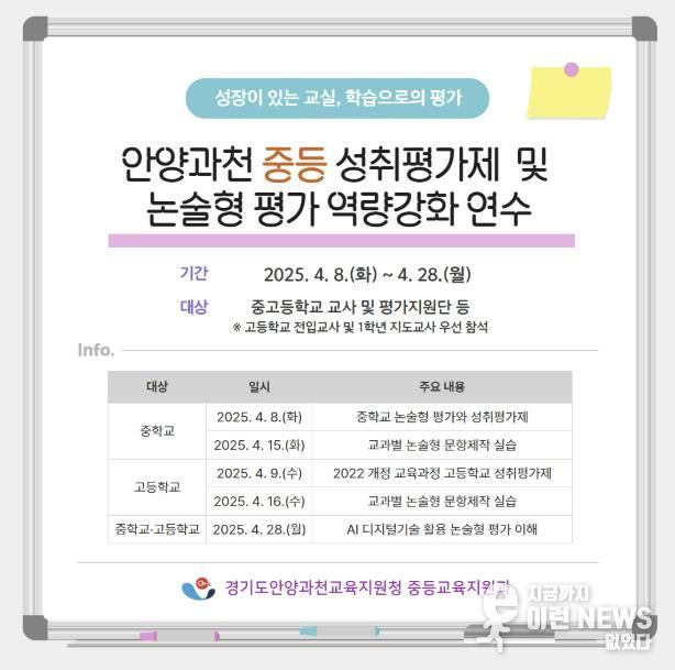 이런뉴스(e-runnews) 김삼성 기자 | 경기도안양과천교육지원청은 2022 개정 교육과정 적용 및 중등 성취평가제 시행에 발맞춰, 선제적으로 학교(교원)의 평가역량 강화를 위한 연수를 계획하여 4월 8일부터 한 달간 집중할 예정이다.