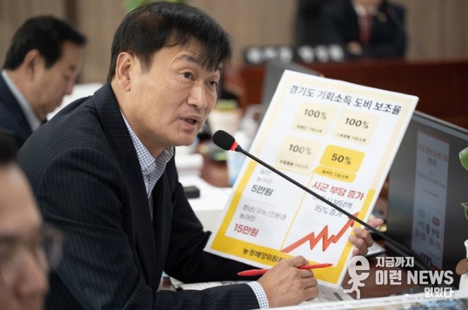 또한 서 의원은 “경기도에는 이미 장애인기회소득, 아동돌봄기회소득, 기후행동기회소득 등 일부 사업이 100% 도비로 추진되고 있다”며 “전체 보조율 상향이 어렵다면, ‘청년·귀농·친환경농어민’으로 불리는 3종 세트에 대해서만이라도 도비 지원을 확대해야 한다”고 제안했다.