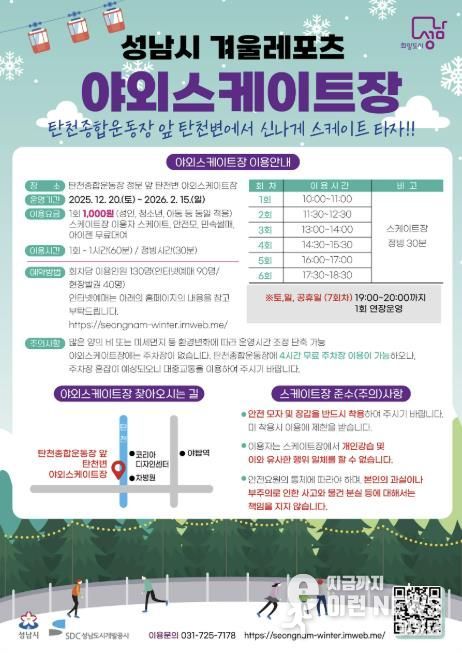 이런뉴스(e-runnews) 김삼성 기자 | 성남시는 분당구 야탑동 탄천변에 야외 스케이트장을, 중원구 성남동 성남종합운동장 야외 주차장에 썰매장을 각각 조성해 오는 12월 20일 문을 연다.