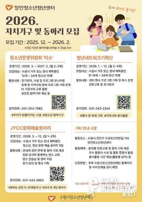 장안청소년청년센터 관계자는“2026년은 스스로 기획하고 실행하는 과정에서 성장할 수 있도록 이끌고, 청소년과 청년이 함께 움직이며 더 큰 지역 변화를 만드는데 중점을 두겠다.”라고 설명했다.
