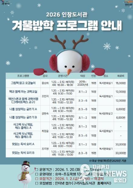 이런뉴스(e-runnews) 김삼성 기자 | 구리시는 겨울방학을 맞은 어린이들을 위해 지역 내 공공도서관 4곳에서 독서를 기반으로 한 창의적이고 체험 중심의 다양한 프로그램을 운영한다.