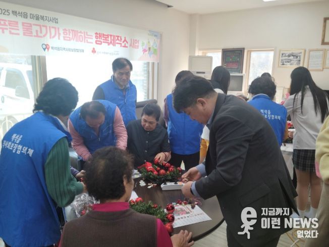 이런뉴스(e-runnews) 김삼성 기자 | 양주시 백석읍 지역사회보장협의체가 지난 17일 연말을 맞아 백석읍 가업1리 경로당에서 ‘푸른 물고기가 함께하는 행복제작소’ 사업의 일환으로 크리스마스 리스와 무드등 만들기 활동을 진행했다.