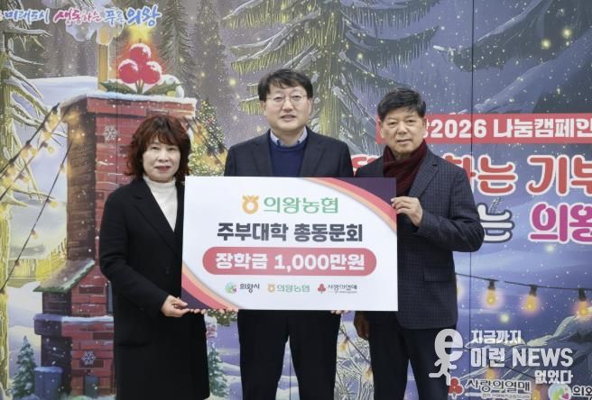이런뉴스(e-runnews) 김삼성 기자 | 의왕시는 12월 18일 ‘의왕농협주부대학 총동문회가 지역 인재 육성을 위해 장학금 1,000만원을 기부했다고 밝혔다.
