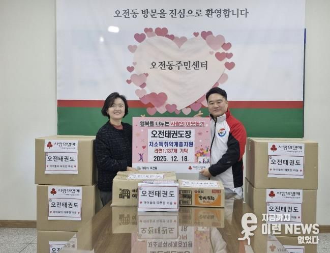 이런뉴스(e-runnews) 김삼성 기자 | 의왕시 오전동에 위치한 오전태권도장의 지도자와 수련생들이 12월 18일, 지역사회의 어려운 이웃을 위해 라면 1,137개를 기부했다.