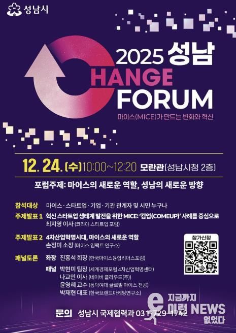 이런뉴스(e-runnews) 김삼성 기자 | 성남시는 오는 12월 24일 오전 10시 성남시청 모란관에서 ‘2025 성남 체인지 포럼(CHANGE Forum)’을 개최한다.