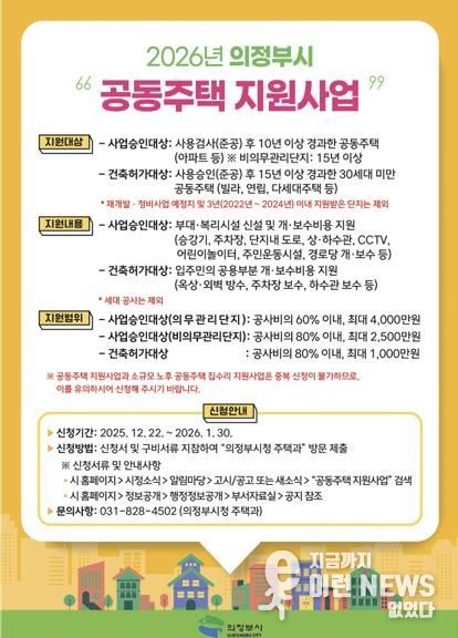 이런뉴스(e-runnews) 김삼성 기자 | 의정부시는 노후 공동주택의 관리비용 부담 완화와 주거환경 개선을 위해 내년 1월 30일까지 ‘2026년 공동주택 지원사업’ 신청을 받는다.