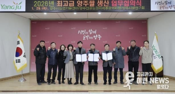양주시는 지난 29일 농업기술센터에서 양주시농업기술센터, 양주연합농협미곡종합처리장, 양주시쌀연구회 등 관계자 10여 명이 참석해 ‘2026년 최고급 양주쌀 생산 및 품질 고급화’를 위한 3자 업무협약을 체결했다.