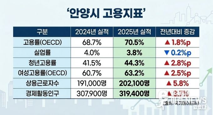 국가데이터처에 따르면, 안양시의 지난해 고용률(OECD)은 70.5%로, 전년 대비 1.8%p 상승했으며, 실업률은 3.8%로 집계돼 0.2%p 하락했다.