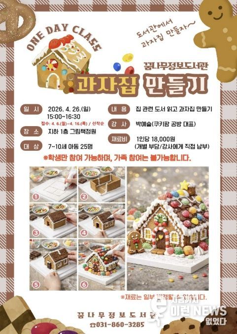 동두천시 도서문화사업소 꿈나무정보도서관에서는 이런 관심에 맞춰 오는 4월 26일 오후 3시부터 4시 30분까지 지하 1층 그림책정원에서‘책 읽고 과자집 만들기’ 일일 강좌(원데이 클래스)를 연다. 참가 신청은 4월 6일부터 선착순으로 진행되며, 모집 인원은 7세부터 10세까지의 아동 25명이다.