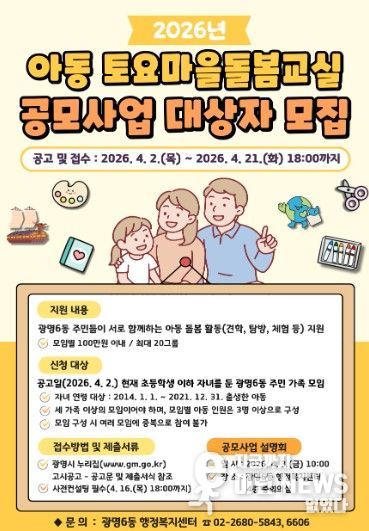 이런뉴스(e-runnews) 김삼성 기자 | 광명시 광명6동 행정복지센터는 오는 21일까지 ‘2026년 아동 토요마을돌봄교실 공모사업’에 참여할 주민 가족 모임 20개 팀을 모집한다.