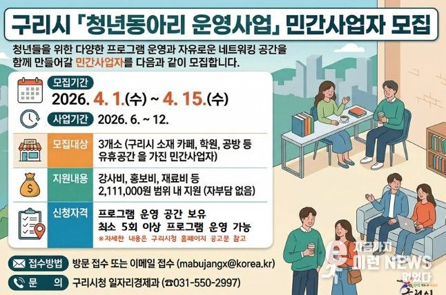 이런뉴스(e-runnews) 김삼성 기자 | 구리시는 4월 1일부터 청년들의 자율적이고 창의적인 활동을 지원하기 위한 ‘구리시 청년동아리’를 운영할 민간사업자를 모집한다고 밝혔다.