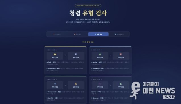 이번 검사는 전 직원을 대상으로 진행됐으며, 자체 제작한 4개 차원, 16개 유형 조합의 검사 도구가 활용됐다. 단순히 ‘청렴한가’를 묻는 것이 아니라, 판단 기준(원칙 vs 상황), 실천 방식(능동 vs 반응), 정보 관리(투명 vs 신중), 동기 원천(내적 vs 외적) 등 4개 영역을 조합하여 개인의 청렴 성향을 분석하는 방식이다.