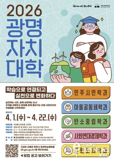 이런뉴스(e-runnews) 김삼성 기자 | 광명시가 시의 핵심의제인 평생학습 마을리더 양성과정 ‘광명자치대학’ 2026년 신입생 125명을 오는 22일까지 모집한다.