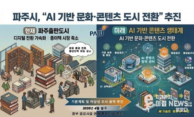 이런뉴스(e-runnews) 김삼성 기자 | 파주시는 출판도시의 지속 가능한 성장 기반 마련을 위해 “인공지능(AI) 기반 문화·콘텐츠 도시 전환을 위한 기본계획 및 타당성 조사 용역”을 추진한다. 관련 용역비는 2026년 제1회 추가경정예산에 신규 편성·확정됐다.