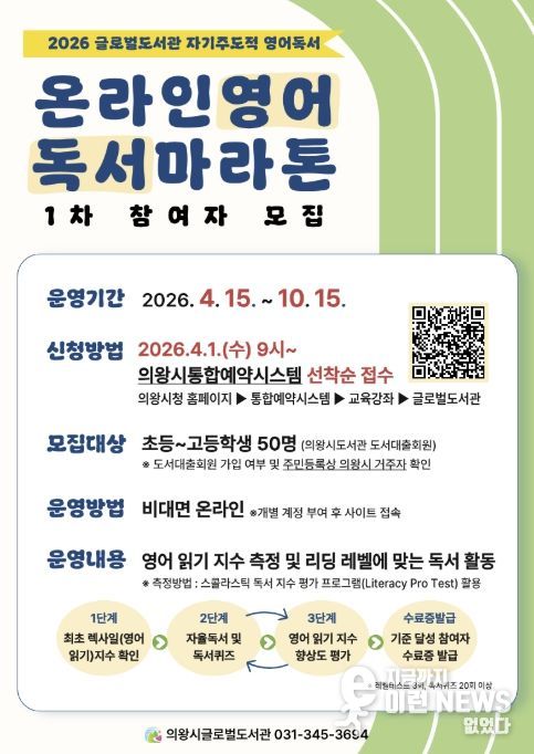 이런뉴스(e-runnews) 김삼성 기자 | 의왕시 글로벌도서관은 학생들의 영어 독서 흥미를 높이고 자기주도적 학습 습관 형성을 지원하기 위해 기획된 '온라인 영어독서마라톤'의 1차 참여자 50명을 모집하고 있다.