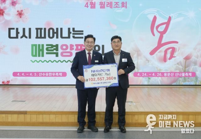 이런뉴스(e-runnews) 김삼성 기자 | 양평군은 지난 4월 1일 NH농협은행 양평군지부로부터 제휴카드 적립기금 1억 256만 원을 기금 수입금으로 전달받았다고 밝혔다.