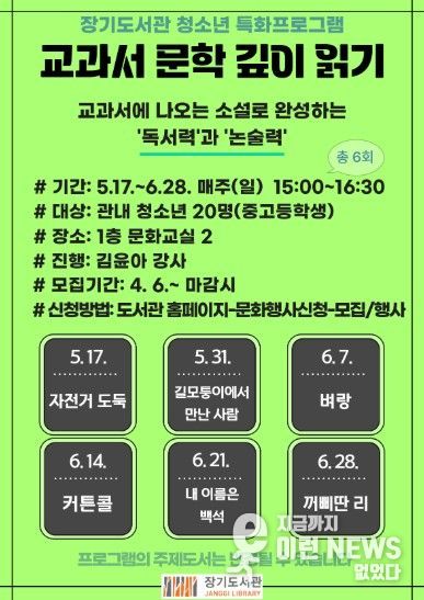 이런뉴스(e-runnews) 김삼성 기자 | 김포시 장기도서관은 청소년의 독서력과 논술력 향상을 위해 '교과서 문학 깊이 읽기' 프로그램을 오는 5월 17일부터 6월 28일까지 진행한다.