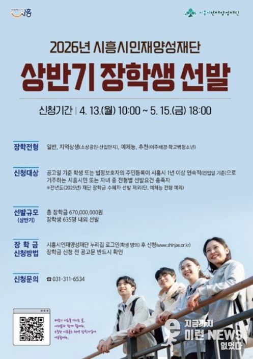 이런뉴스(e-runnews) 김삼성 기자 | (재)시흥시인재양성재단은 지역 인재 양성과 교육 기회 확대를 위해 ‘2026년 상반기 장학생’을 635명 내외로 선발한다. 장학금 규모는 총 6억 7천만 원이다.