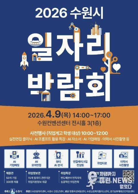 이런뉴스(e-runnews) 김삼성 기자 | 수원특례시는 9일 오후 2시부터 5시까지 수원컨벤션센터 전시홀에서 ‘2026 수원시 일자리박람회’를 개최한다.