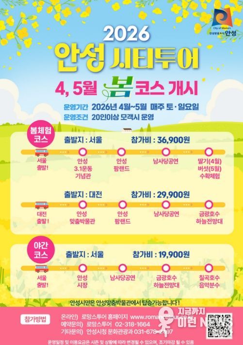 이런뉴스(e-runnews) 김삼성 기자 | 안성시가 따뜻한 봄을 맞아 관광객들에게 다채로운 체험과 볼거리를 제공하기 위해 ‘2026 안성 시티투어 봄 코스’를 오는 4월부터 5월까지 운영한다.