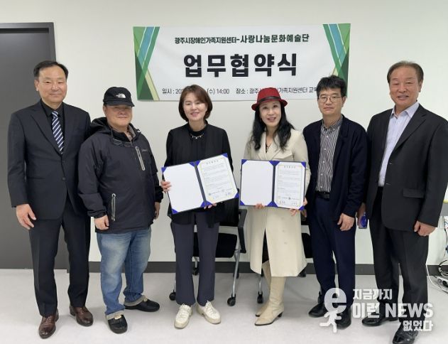 이런뉴스(e-runnews) 김삼성 기자 | 광주시장애인가족지원센터는 지난 1일 비영리민간단체 사랑나눔문화예술단과 장애인 가족의 문화예술 향유 기회 확대와 삶의 질 향상을 위한 업무협약을 체결했다.