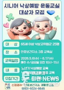 이런뉴스(e-runnews) 김삼성 기자 | 평택시 안중보건지소에서는 65세 이상 근력저하자(허약 노인) 및 낙상 고위험군인 노년층 지역주민을 대상으로 ‘시니어 낙상예방 운동교실’을 오는 5월 6일부터 6월 17일까지 매주 수·금요일 10:00~11:00 총 12회에 걸쳐 진행한다.