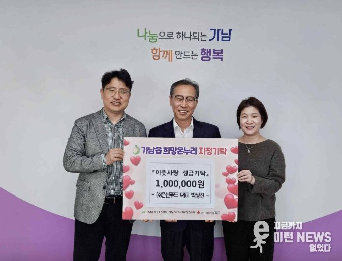 이런뉴스(e-runnews) 김삼성 기자 | 여주시 가남읍 소재 (주)은산푸드는 지난 6일 가남읍 행정복지센터를 방문하여 관내 저소득 소외계층을 위한 이웃돕기 성금 100만 원을 전달했다.
