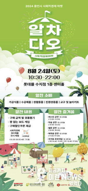 이런뉴스(e-runnews) 김삼성 기자 | 용인특례시는 오는 24일 수지구 성복동 롯데몰 수지점에서 지역의 사회적경제기업 26곳이 생산한 제품을 알리는 ‘마켓 알차다오’ 행사를 개최한다고 20일 밝혔다.