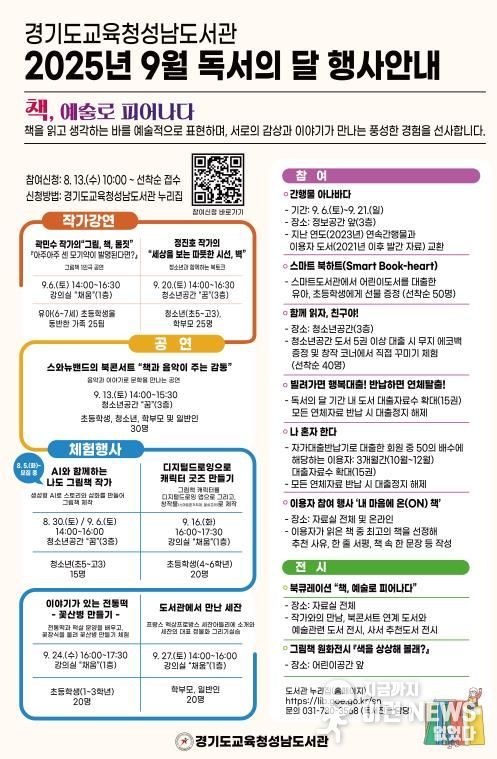 이런뉴스(e-runnews) 김삼성 기자 | 경기도교육청성남도서관이 9월 독서의 달을 맞아 ‘책, 예술로 피어나다’를 주제로 한 다양한 독서문화 행사를 운영한다.