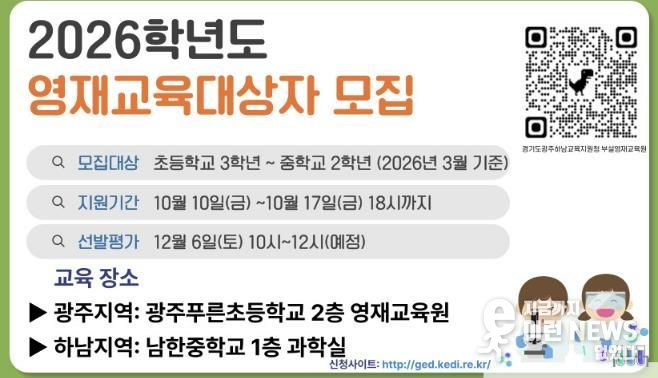 이런뉴스(e-runnews) 김삼성 기자 | 경기도광주하남교육지원청이 2026학년도 부설영재교육원 영재교육대상자 선발을 시작한다. 지원서 접수는 10월 10일부터 진행되며, 대상은 접수일 기준 광주·하남 지역의 초등학교 2학년부터 중학교 1학년까지다.