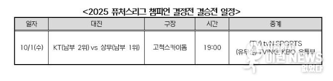 퓨처스리그 초대 챔피언이 결정될 결승전은 10월 1일(수) 오후 7시 고척스카이돔에서 열리며, 결승전은 TVING과 tvN SPORTS 및 KBO 유튜브를 통해 중계된다.