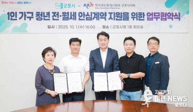 이런뉴스(e-runnews) 김삼성 기자 | 군포시는 10월 1일 시청 1층 회의실에서 한국공인중개사협회 군포시지회와 청년 1인 가구 전월세 안심계약 지원을 위한 업무협약을 체결했다.