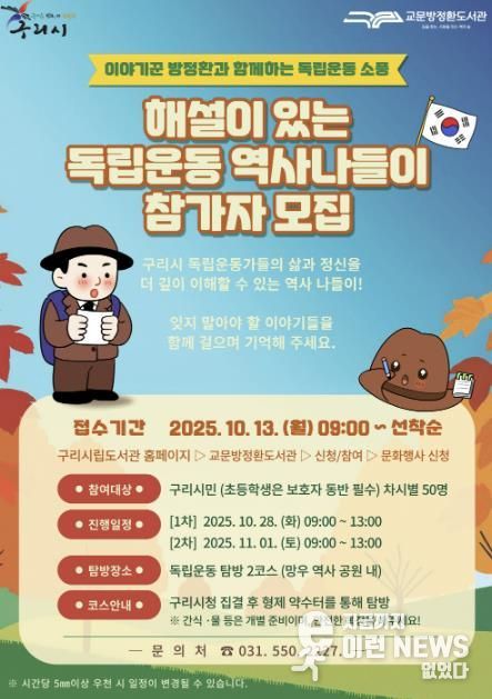 이런뉴스(e-runnews) 김삼성 기자 | 구리시는 오는 10월 13일부터 27일까지 교문 방정환 도서관에서 진행하는 ‘해설이 있는 독립운동 역사 나들이’ 프로그램의 참여자를 모집한다고 밝혔다.
