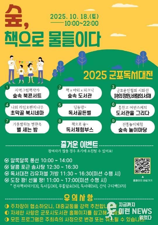 하은호 군포시장은 “2025 군포독서대전은 단순한 책 축제가 아니라 시민이 책과 자연 속에서 교감하며 휴식과 영감을 얻는 문화의 장이 될 것”이라며 “책 읽는 도시 군포의 정체성을 강화하고 시민의 문화적 자긍심을 높이는 대표 축제로 발전시켜 나가겠다”고 밝혔다.