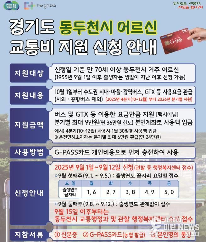 이런뉴스(e-runnews) 김삼성 기자 | 동두천시는 만 70세 이상 어르신의 대중교통비 부담을 덜기 위해 ‘어르신 교통비 지원사업’을 적극 추진하고 있다고 10일 밝혔다.