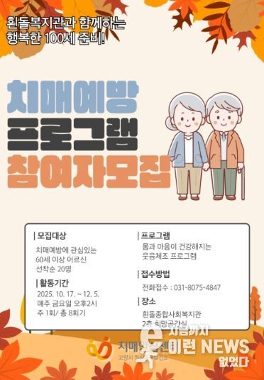 이번 치매예방프로그램은 60세 이상 어르신을 대상으로 전문 웃음치료사의 지도 아래 10월 17일부터 매주 금요일, 총 8회에 걸쳐 진행된다.