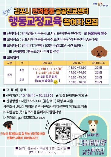 이런뉴스(e-runnews) 김삼성 기자 | 김포시는 반려동물 공공진료센터 연계 프로그램의 일환으로 운영 중인 ‘반려견 행동교정교육’의 제6기 참여자를 10월 15일부터 22일까지 모집한다고 밝혔다.