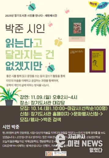 이런뉴스(e-runnews) 김삼성 기자 | 김포시 장기도서관은 2025년 공공도서관 독서프로그램 운영 지원사업으로 '시인을 만나다-박준 시인'을 오는 11월 9일, 오후 2시부터 4시까지 장기도서관 대강당에서 운영한다고 밝혔다
