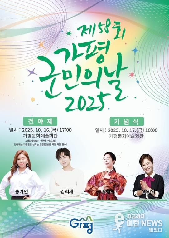 이런뉴스(e-runnews) 김삼성 기자 | 가평군은 오는 16일 오후 5시, 새롭게 리모델링을 마친 가평문화예술회관에서 ‘제58회 가평군민의 날 전야제’를 개최한다. 이번 행사는 ‘다시, 가평으로’를 슬로건으로 내세워 수해 극복과 지역 재도약을 기원하며 군민 화합의 의미를 담아 열린다.