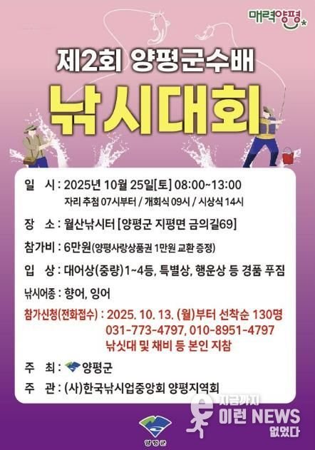 이런뉴스(e-runnews) 김삼성 기자 | 양평군은 오는 25일 관내 월산낚시터에서 ‘제2회 양평군수배 낚시 대회’를 개최한다고 밝혔다.