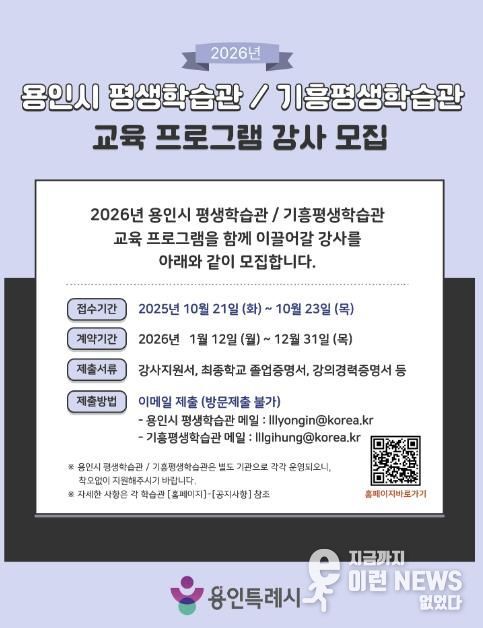 이런뉴스(e-runnews) 김삼성 기자 | 용인특례시는 21일부터 23일까지 3일간 ‘2026년 평생학습관 프로그램’을 운영할 강사를 모집한다고 15일 밝혔다.