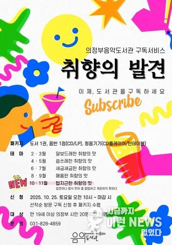 이런뉴스(e-runnews) 김삼성 기자 | 의정부음악도서관은 시민이 다양한 감성과 취향을 발견하고 경험할 수 있도록 기획한 구독형 문화서비스 ‘취향의 발견’의 2025년 다섯 번째 이야기 ‘텁지근한 취향의 맛’ 편을 10월 25일부터 운영한다.