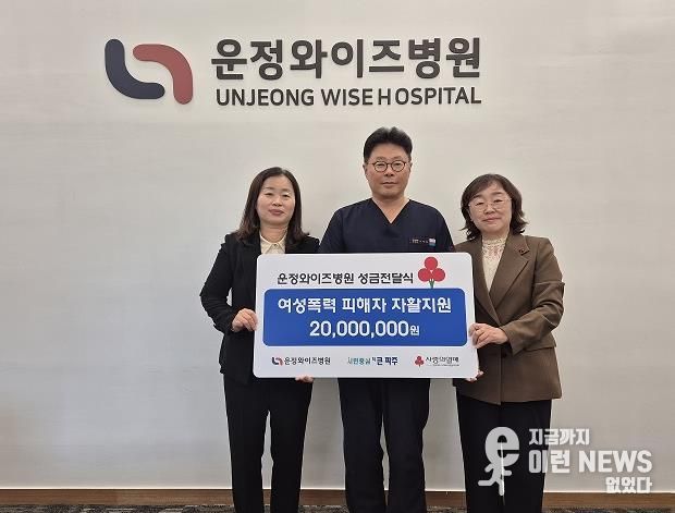 이날 기탁금 전달식에 참석한 노성혁 원장은 “어려운 상황에 놓인 여성폭력 피해자들이 용기와 희망을 되찾는 데 조금이나마 힘이 되고 싶다”라며 “운정와이즈병원은 앞으로도 지역사회 의료기관으로서 사회적 책임을 다하고, 나눔과 상생의 가치를 실천하는 데 앞장서겠다”라고 밝혔다.