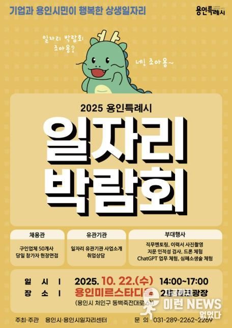 이런뉴스(e-runnews) 김삼성 기자 | 용인특례시는 오는 22일 오후 2시부터 5시까지 용인미르스타디움 2층 덱(deck) 광장에서 2025년 하반기 일자리박람회를 개최한다고 17일 밝혔다.