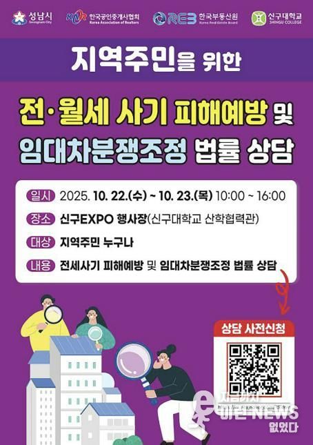 이런뉴스(e-runnews) 김삼성 기자 | 성남시는 오는 10월 22일부터 23일까지 양일간 오전 10시부터 오후 4시까지 신구대학교 신구EXPO 행사장에서 ‘전세사기 피해예방 상담 부스’를 운영한다.