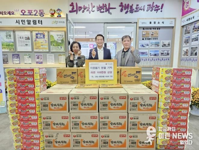 이런뉴스(e-runnews) 김삼성 기자 | 광주시 양벌동 e편한세상 아파트 입주민들은 지난 16일 광주시 오포2동을 방문해 어려운 이웃을 돕기 위한 라면(160만 원 상당)을 기탁했다.