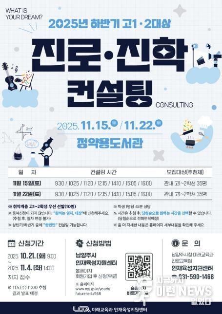 이런뉴스(e-runnews) 김삼성 기자 | 남양주시는 오는 21일부터 ‘2025년 하반기 진로·진학 컨설팅’참가자를 모집한다고 밝혔다.
