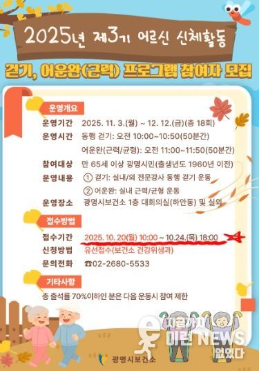 이런뉴스(e-runnews) 김삼성 기자 | 광명시 보건소는 지역 어르신들의 건강한 노후를 지원하기 위해 ‘2025년 제3기 어르신 신체활동 프로그램’을 오는 20일부터 23일까지 4일간 모집한다.