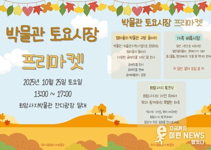 이런뉴스(e-runnews) 김삼성 기자 | 양주시립회암사지박물관이 오는 25일 오후 1시부터 5시까지 가을을 맞아 “박물관 토요시장” 프리마켓을 운영한다.